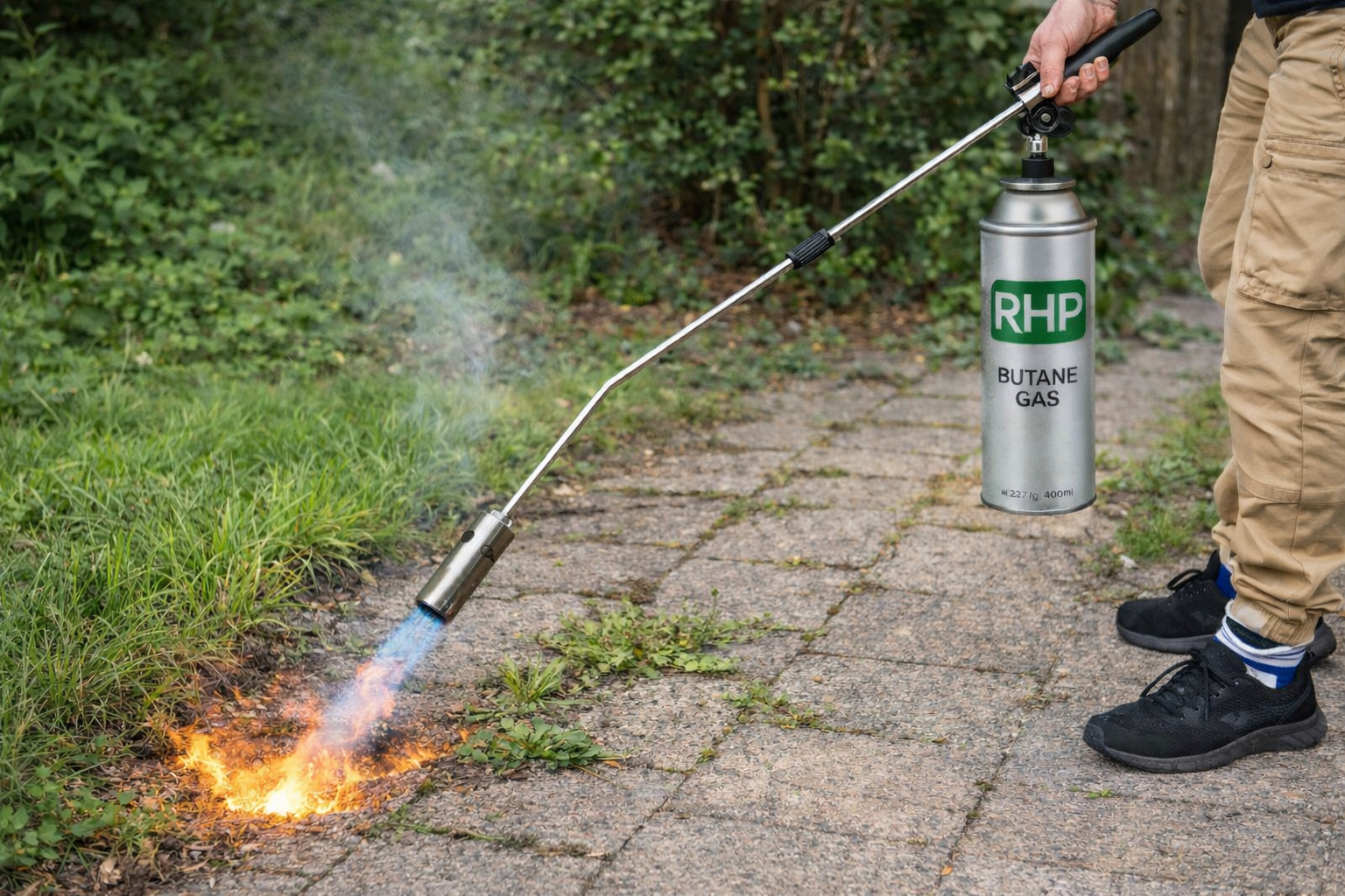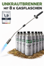 Unkrautbrenner RHP Unkrautvernichter 80cm, inkl. 8 Butan Gaskartuschen je 227g, Gasbrenner mit Piezo-Zündung, Abflammgerät max 1000 °C, Brenner Flamme regulierbar, Grillanzünder